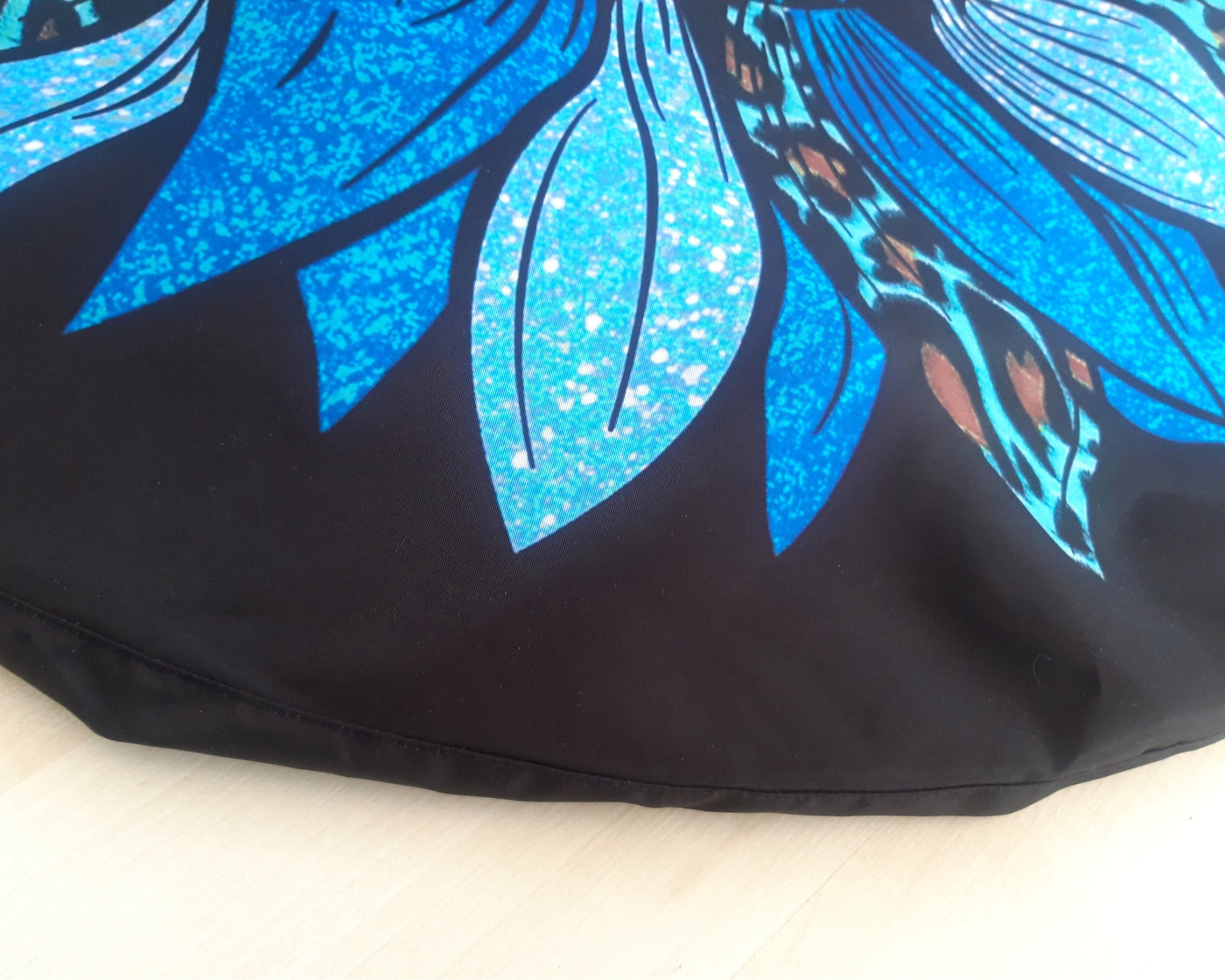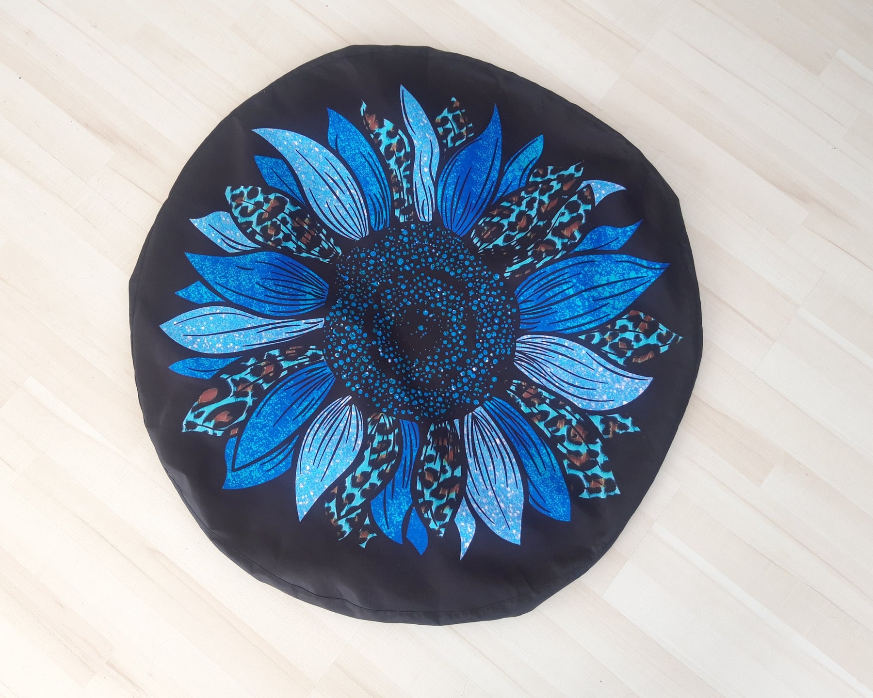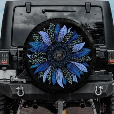 This gorgeous blue sunflower tire cover belongs to our Boho Tire Cover collection. Our Boho tire covers are designed for Jeep, Bronco, campers and trailers. They feature sunflowers, mandalas and other girly tire cover designs.