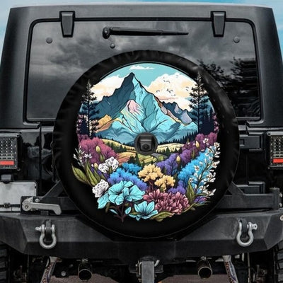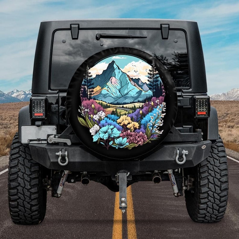 This spare tire cover features beautiful, floral mountain scenery. It belongs to our collection of Camping tire covers. Our camping spare tire covers are compatible with travel trailers, campers, Jeeps and Broncos and feature themes inspired by the great outdoors and our love for nature and camping.
