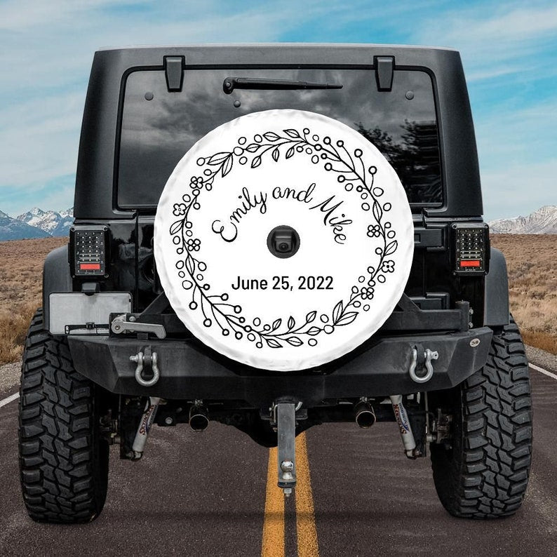 This Personalized wedding spare tire cover for your Jeep or other wedding vehicle is a perfect way to decorate your car for your special day. After you place an order, please send a message to support@coverdom with your order number, as well as the names and the date you want to be printed on the cover.