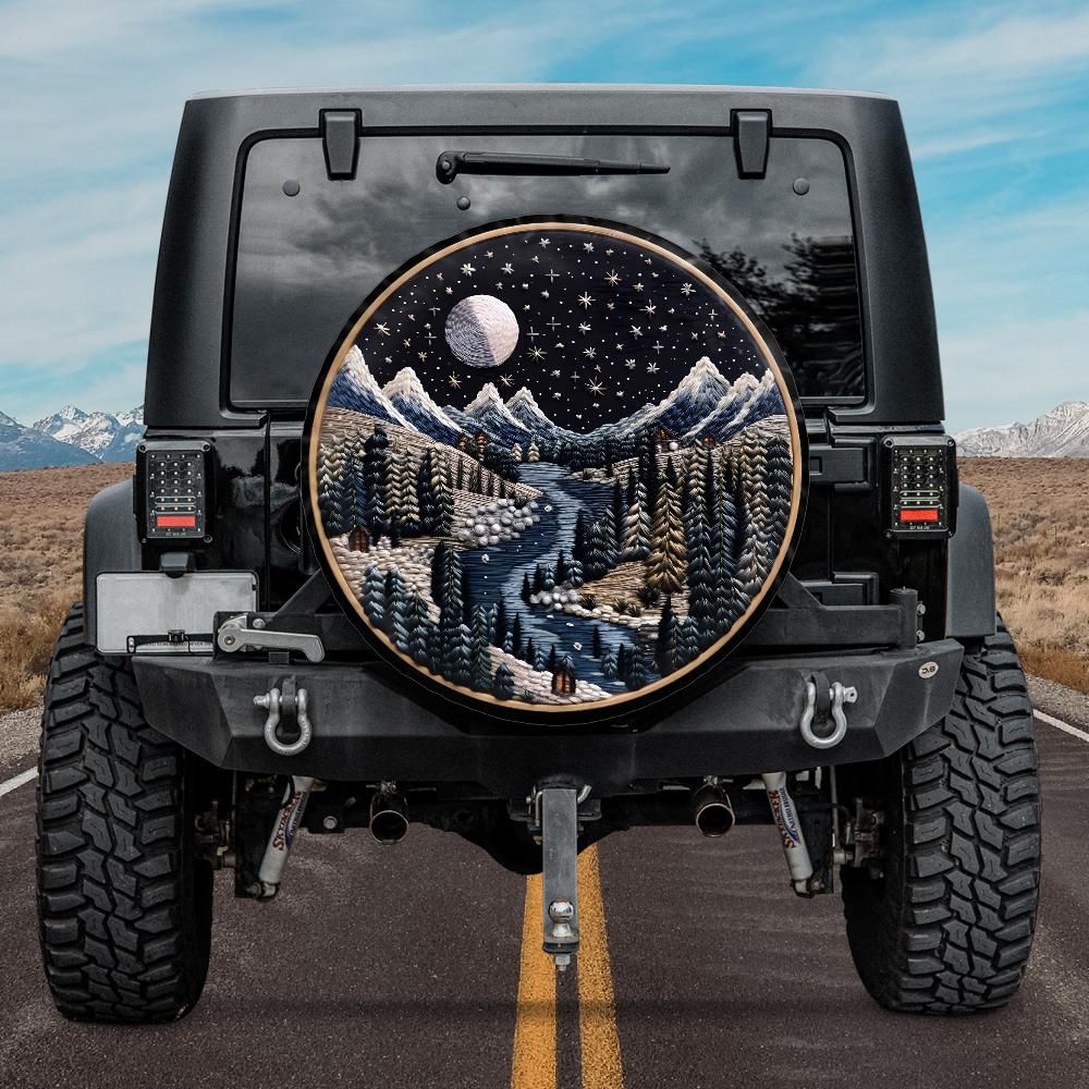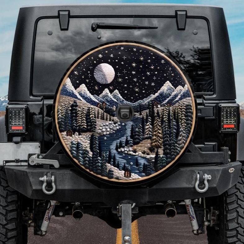 This gorgeous tire cover features beautiful winter forest landscape in faux embroidery style. It belongs to our collection of Camping tire covers. Our camping spare tire covers are compatible with travel trailers, campers, Jeeps and Broncos and feature themes inspired by the great outdoors and our love for nature and camping.