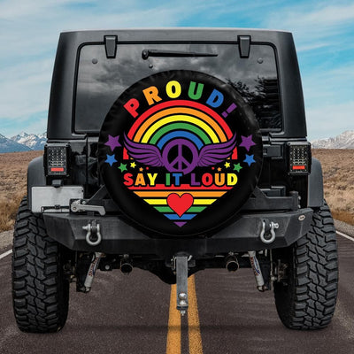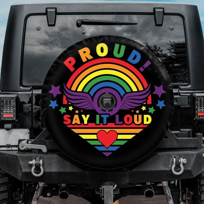 This Gay Pride spare tire cover with Proud Say it Loud design is a part of our LGBT tire cover collection. Check it out to see the whole selection of unique spare tire covers that support and advocate for Gay Rights. Compatible with Jeep, Bronco, RVs, trailers and campers.
