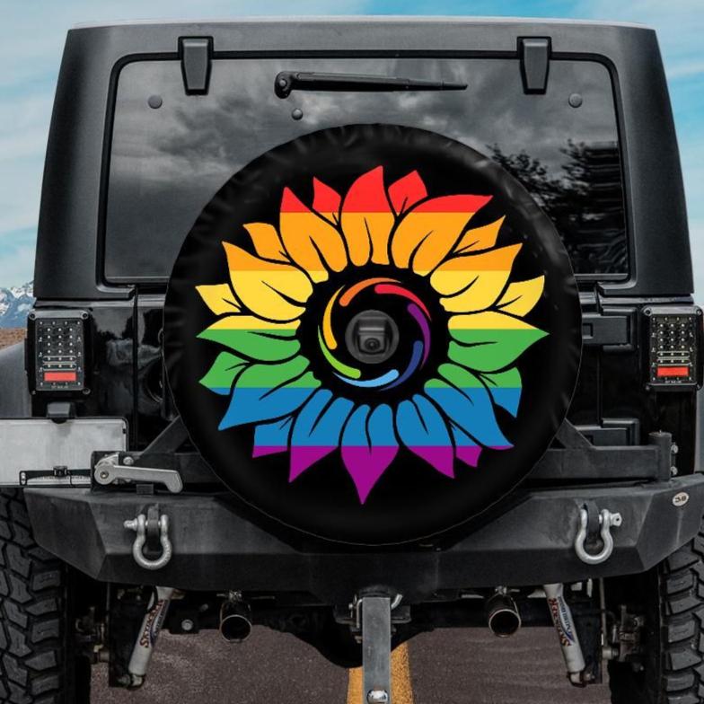 This Rainbow Sunflower spare tire cover is a part of our LGBT tire cover collection. Check it out to see the whole selection of unique spare tire covers that support and advocate for Gay Rights. Compatible with Jeep, Bronco, RVs, trailers and campers.