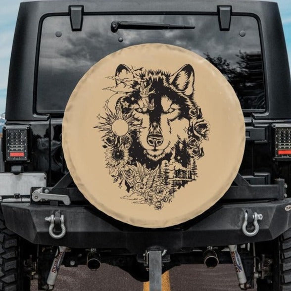 This beige spare tire cover features beautiful wolf design. It belongs to our Boho Tire Cover collection. Our Boho tire covers are designed for Jeep, Bronco, campers and trailers. They feature sunflowers, mandalas and other girly tire cover designs.