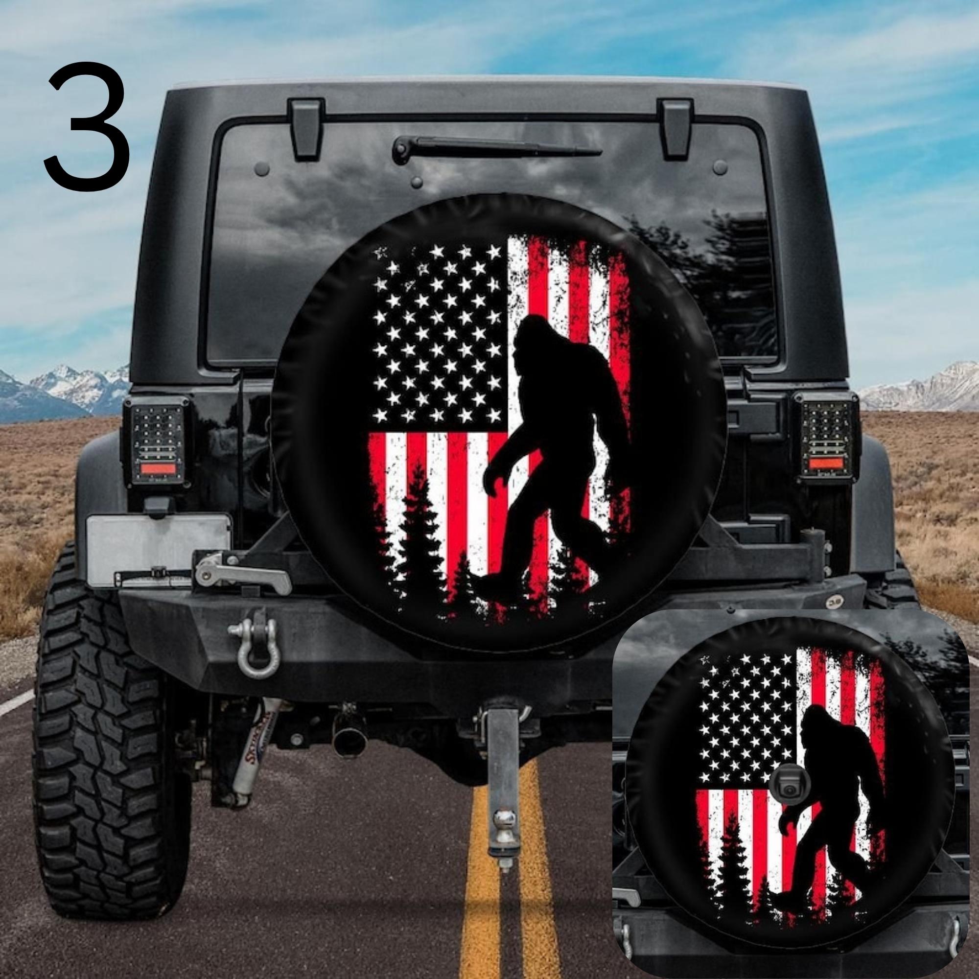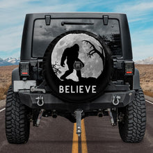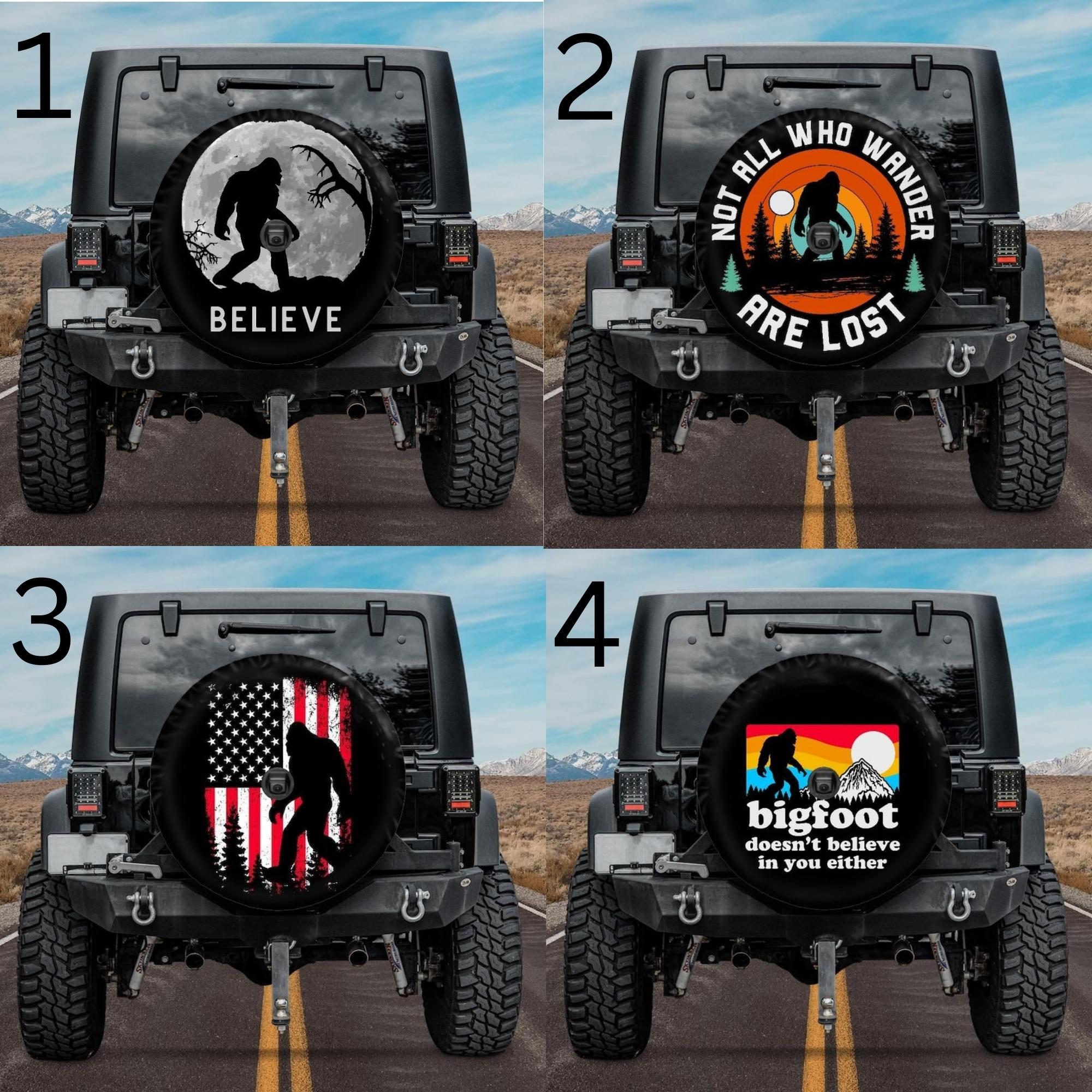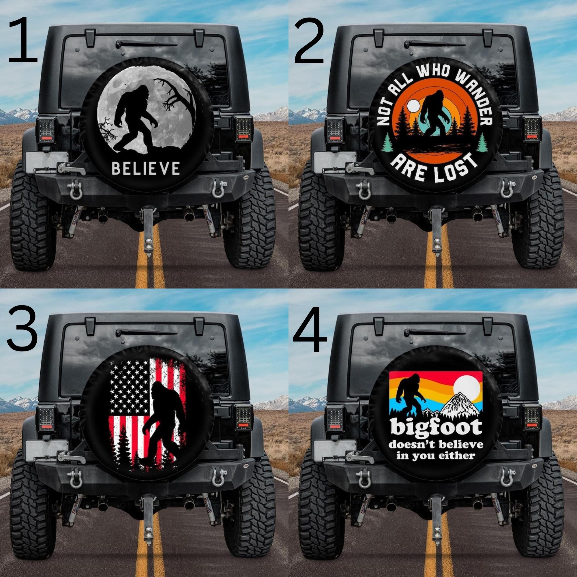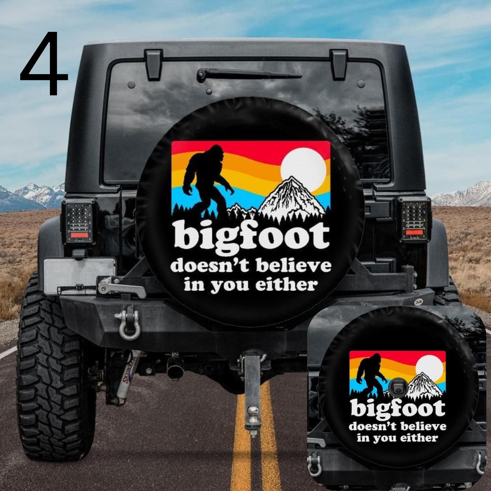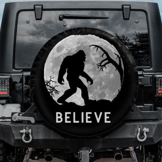 This Bigfoot Believe spare tire cover features Sasquatch and the full moon. It belongs to our Bigfoot Tire Cover collection. Our Bigfoot tire covers are compatible with travel trailers, campers, Jeeps and Broncos and feature themes inspired by the Lone Star State, such as longhorns, cowboys, Bigfoot, and of course the iconic Texas outline.