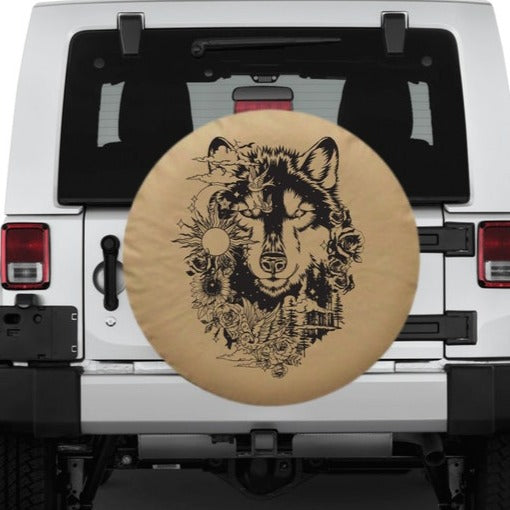 This beige spare tire cover features beautiful wolf design. It belongs to our Boho Tire Cover collection. Our Boho tire covers are designed for Jeep, Bronco, campers and trailers. They feature sunflowers, mandalas and other girly tire cover designs.