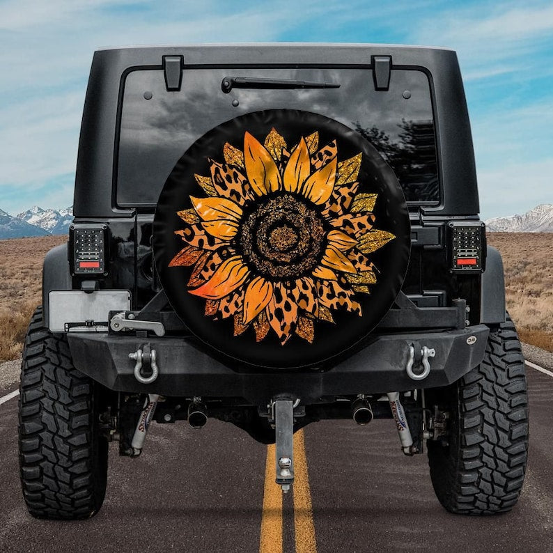 This golden yellow sunflower tire cover belongs to our Boho Tire Cover collection. Our Boho tire covers are designed for Jeep, Bronco, campers and trailers. They feature sunflowers, mandalas and other girly tire cover designs.