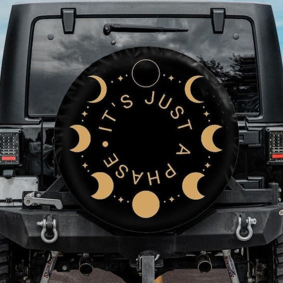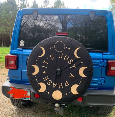 This gorgeous spare tire cover features moon phases and a quote "It's Just a Phase". It belongs to our Boho Tire Cover collection. Our Boho tire covers are designed for Jeep, Bronco, campers and trailers. They feature sunflowers, mandalas and other girly tire cover designs.