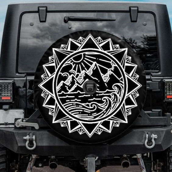This mandala mountain tire cover with black and white design belongs to our collection of Camping tire covers. Our camping spare tire covers are compatible with travel trailers, campers, Jeeps and Broncos and feature themes inspired by the great outdoors and our love for nature and camping.