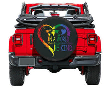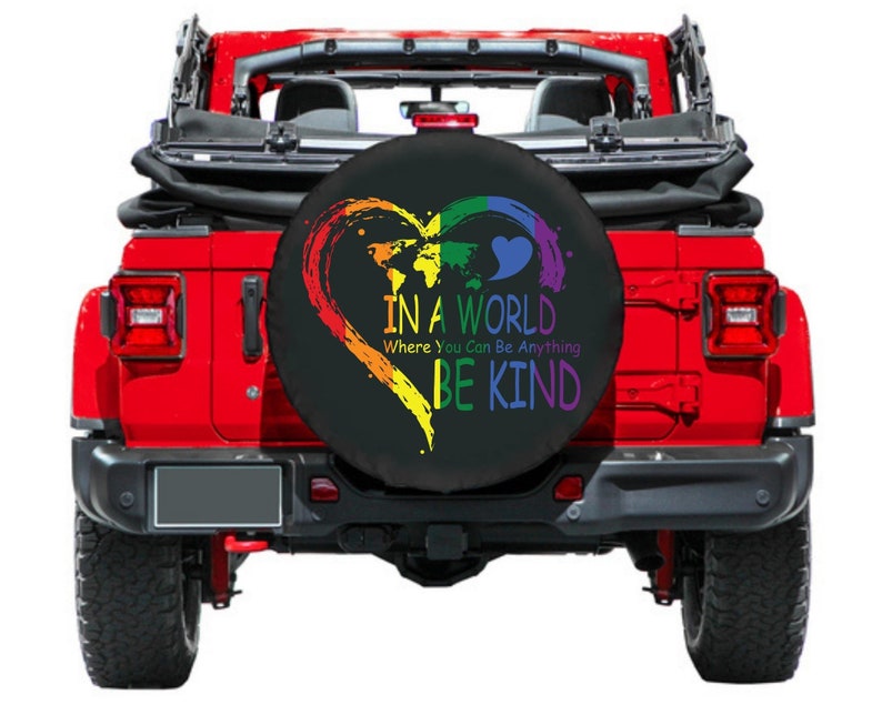 This Gay Pride spare tire cover with Rainbow heart design is a part of our LGBT tire cover collection. Check it out to see the whole selection of unique spare tire covers that support and advocate for Gay Rights. Compatible with Jeep, Bronco, RVs, trailers and campers.